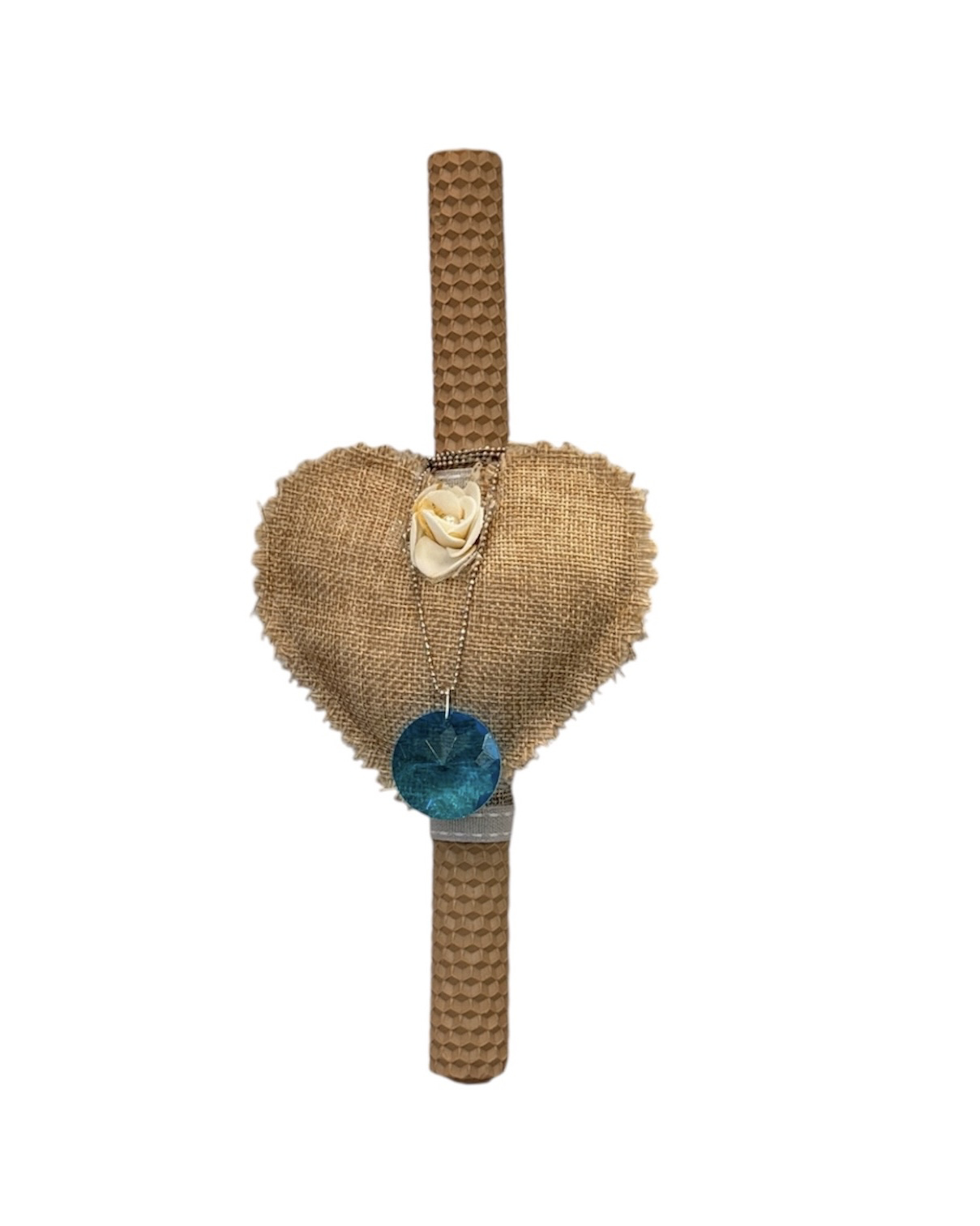 Λαμπάδα χειροποίητη με μελισσοκέρι μπεζ χρώματος και υφασμάτινη καρδιά. Συνδυάζεται με κολιέ γαλάζιου κρυστάλλου.