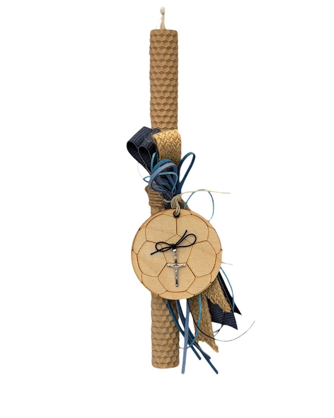 Λαμπάδα χειροποίητη με μπεζ μελισσοκέρι στολισμένη με ξύλινο διακοσμητικό και συνδυασμένη με ασημένιο σταυρό.