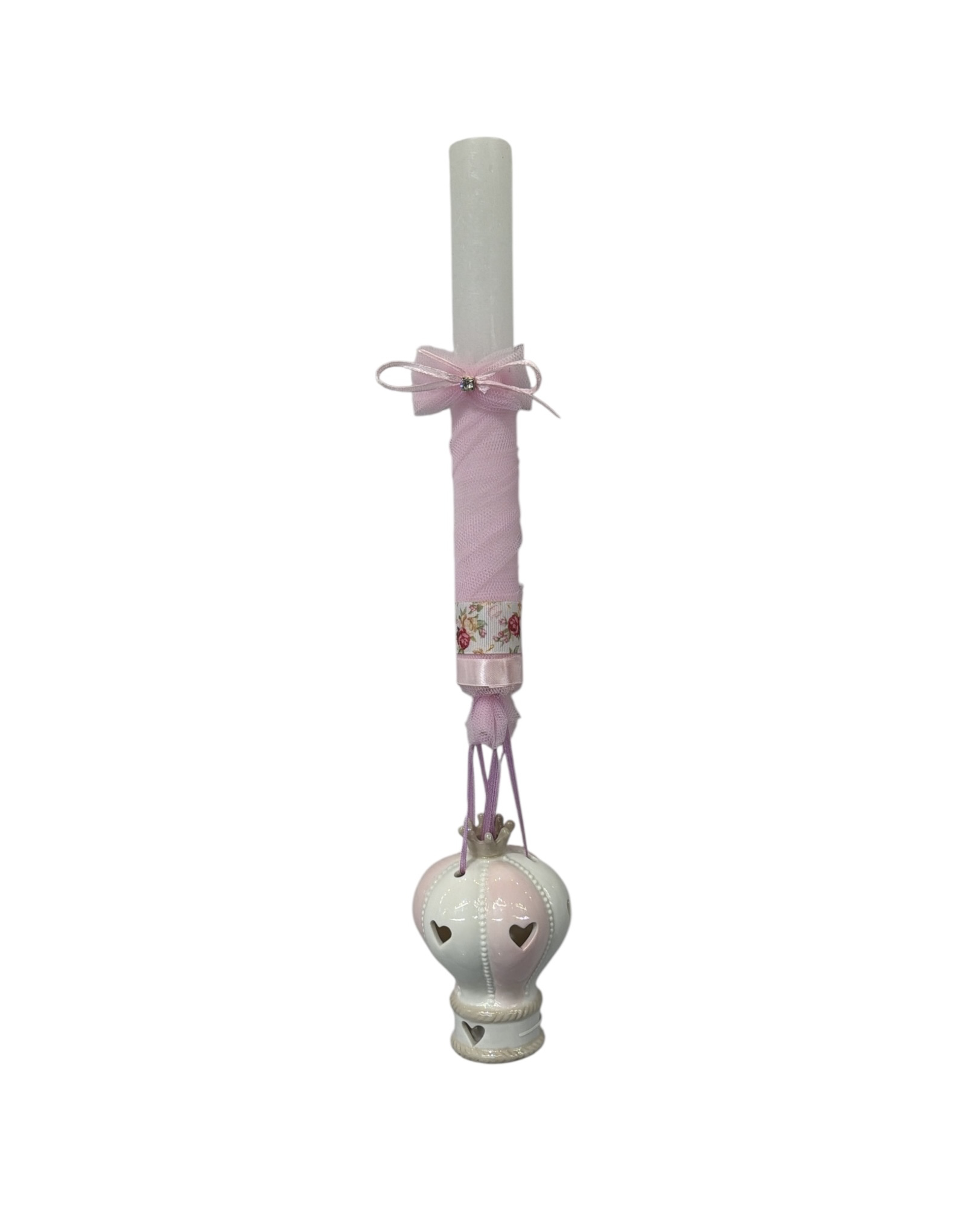 Λαμπάδα χειροποίητη με λευκό κερί, κορδέλες και διακοσμητικό κρεμαστό στοιχείο.