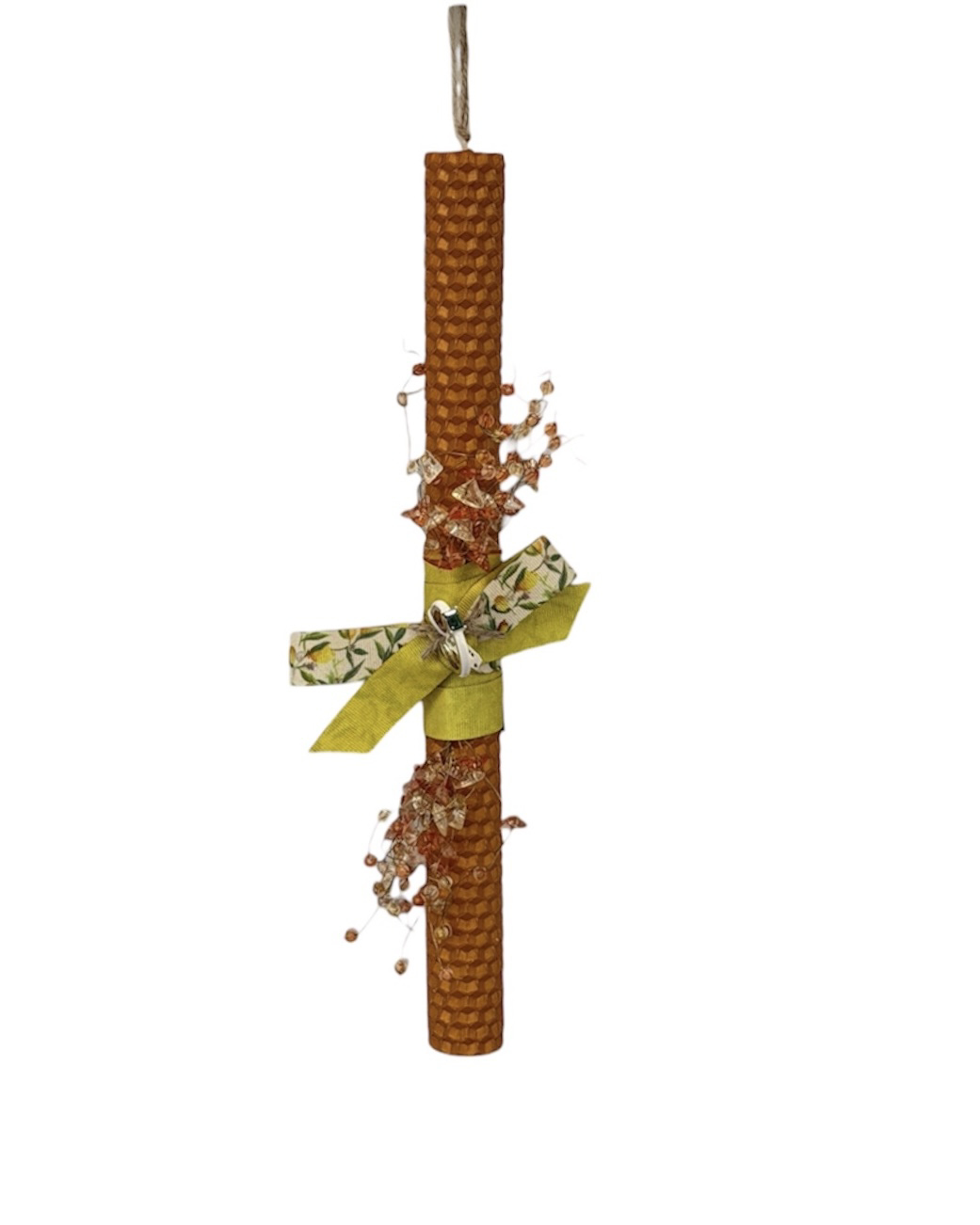 Λαμπάδα χειροποίητη με μελισσοκέρι πορτοκαλί χρώματος συνδυασμένο με ασημένιο δαχτυλίδι.