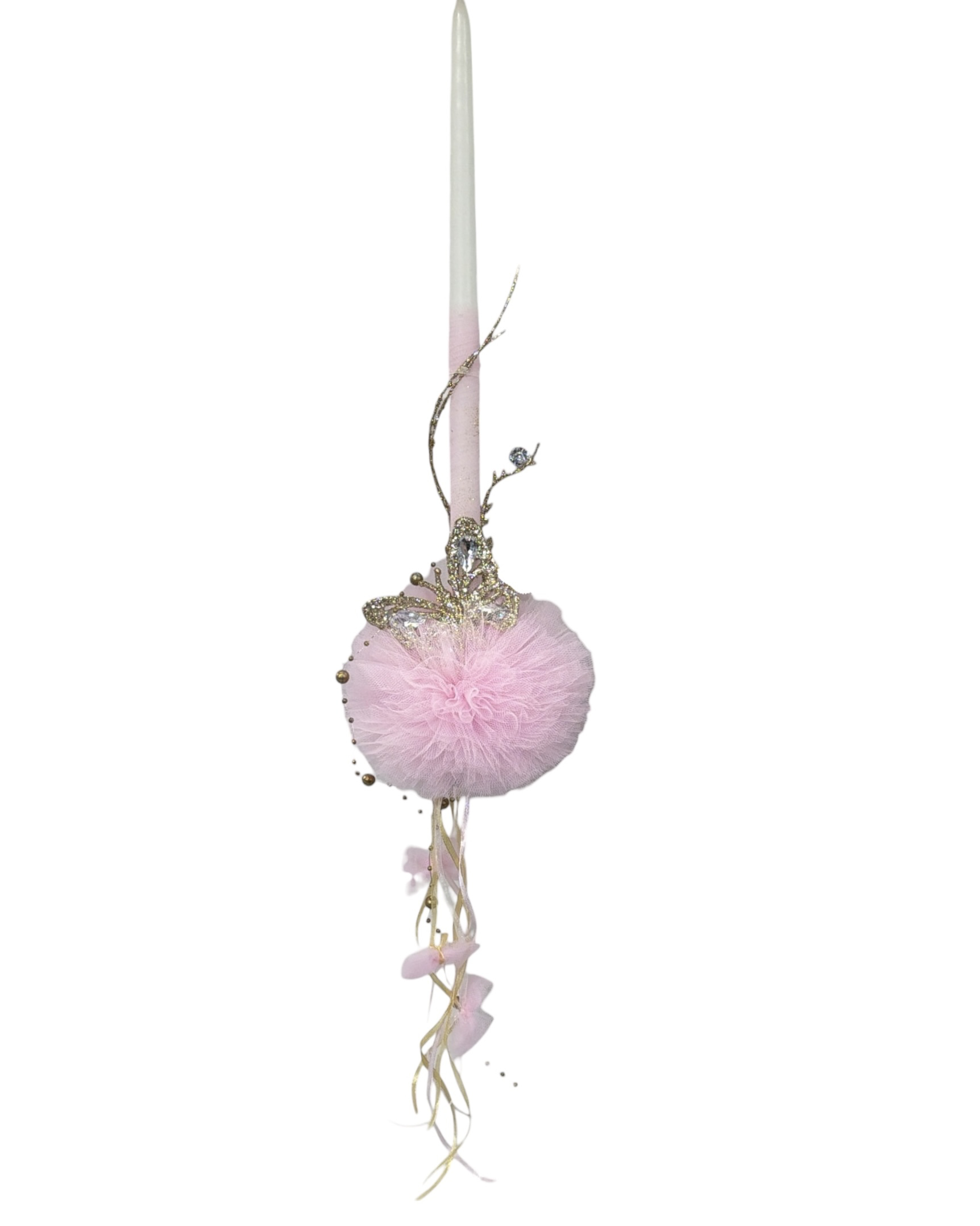 Λαμπάδα χειροποίητη με εντυπωσιακό μέγεθος φουρό, πούλιες και πεταλούδα από γκλίτερ.