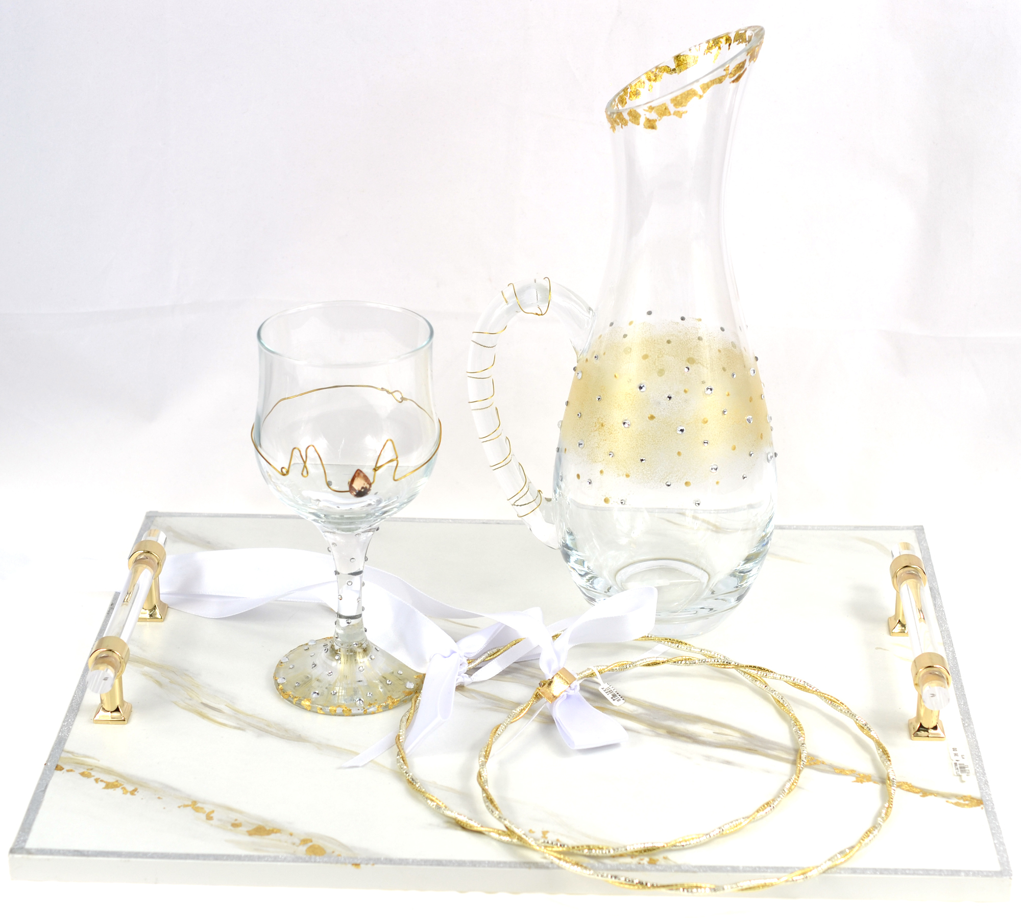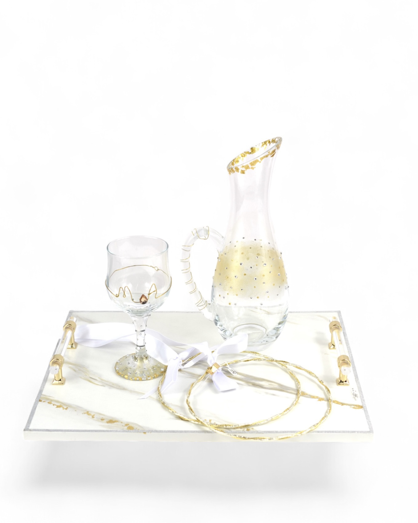 Σετ κουμπάρου χειροποίητο από δίσκο μαρνάρινο στυλ, καράφα με στρας και χρυσών λεπτομεριών, ποτήρι με αρχικά του ζευγαριού που προσωποποιούνται και επάργυρα στέφανα που δεν αλλοιώνονται.