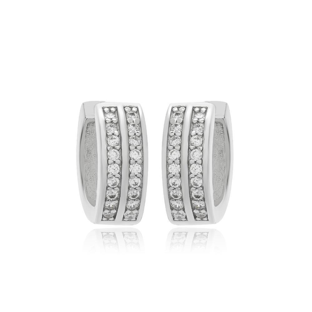 Σκουλαρίκια ασημένια σε σχέδιο κρίκων καμπυλωτού σχέδιου μικρού μεγέθους με καρφωμένες ζιργκόν πέτρες.
