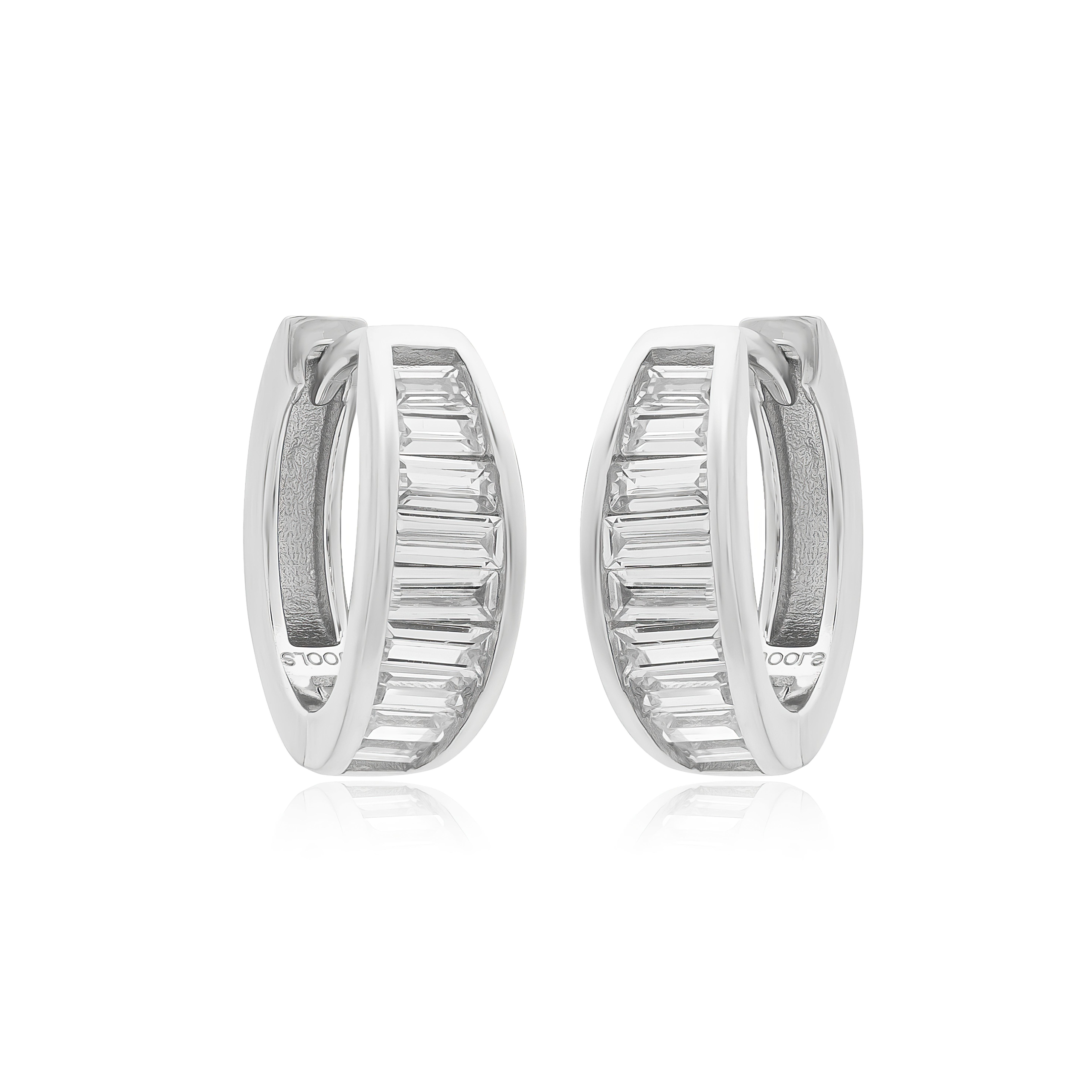 Σκουλαρίκια ασημένια σε σχέδιο κρίκων καμπυλωτού σχέδιου μικρού μεγέθους με ορθογώνιες ζιργκόν πέτρες.