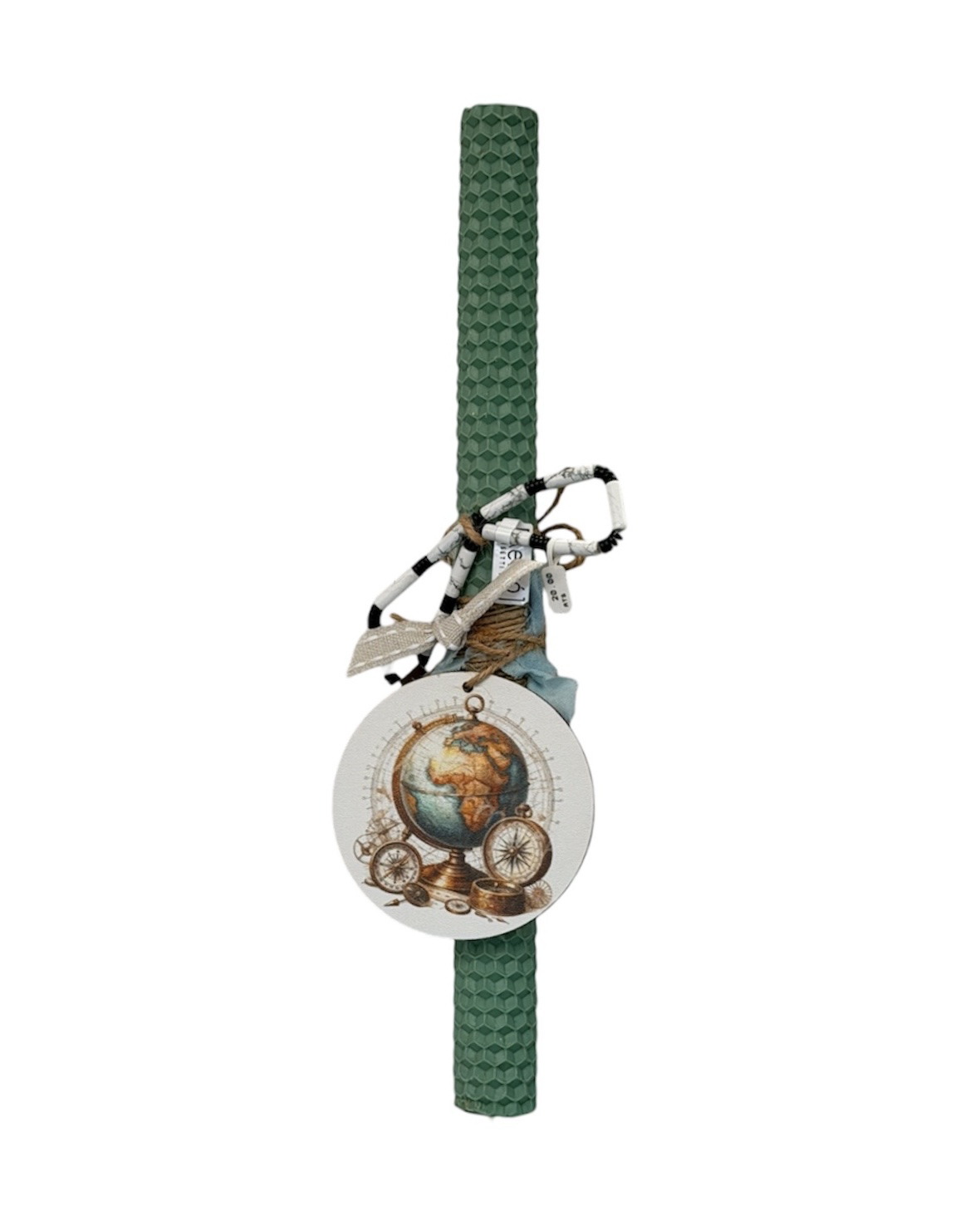 Λαμπάδα χειροποίητη με μελισσοκέρι δεμένο με ξύλινο μοτίφ και κορδέλες. Συνδυάζεται με βραχιόλι, συνολικού κόστους 32€.