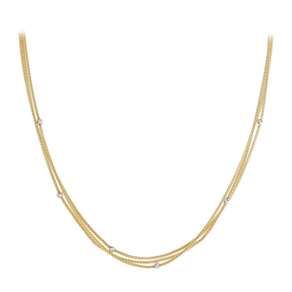 Κολιέ με πολλαπλές αλυσίδες σε χρυσό 14 καρατίων με σφυρήλατες μίλιες σε λευκό χρώμα.