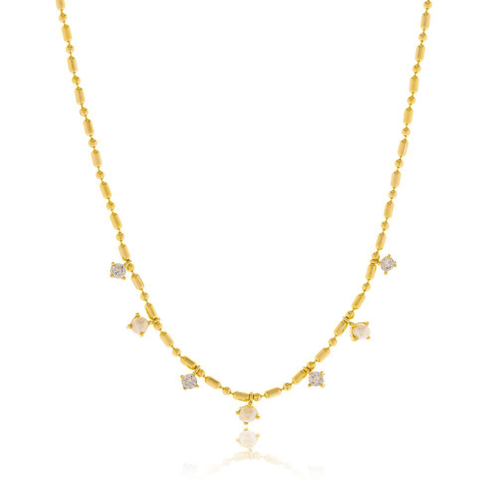 Κολιέ ασημένιο επιχρυσωμένο με ζιργκόν πέτρες και πέρλες κρεμαστές κατά μήκος.