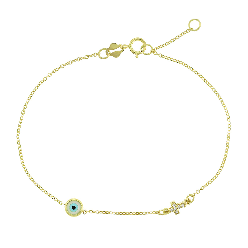 Βραχιόλι χρυσό 09 καρατίων με λεπτή αλυσίδα και ζιργκόν πέτρες στον σταυρό.