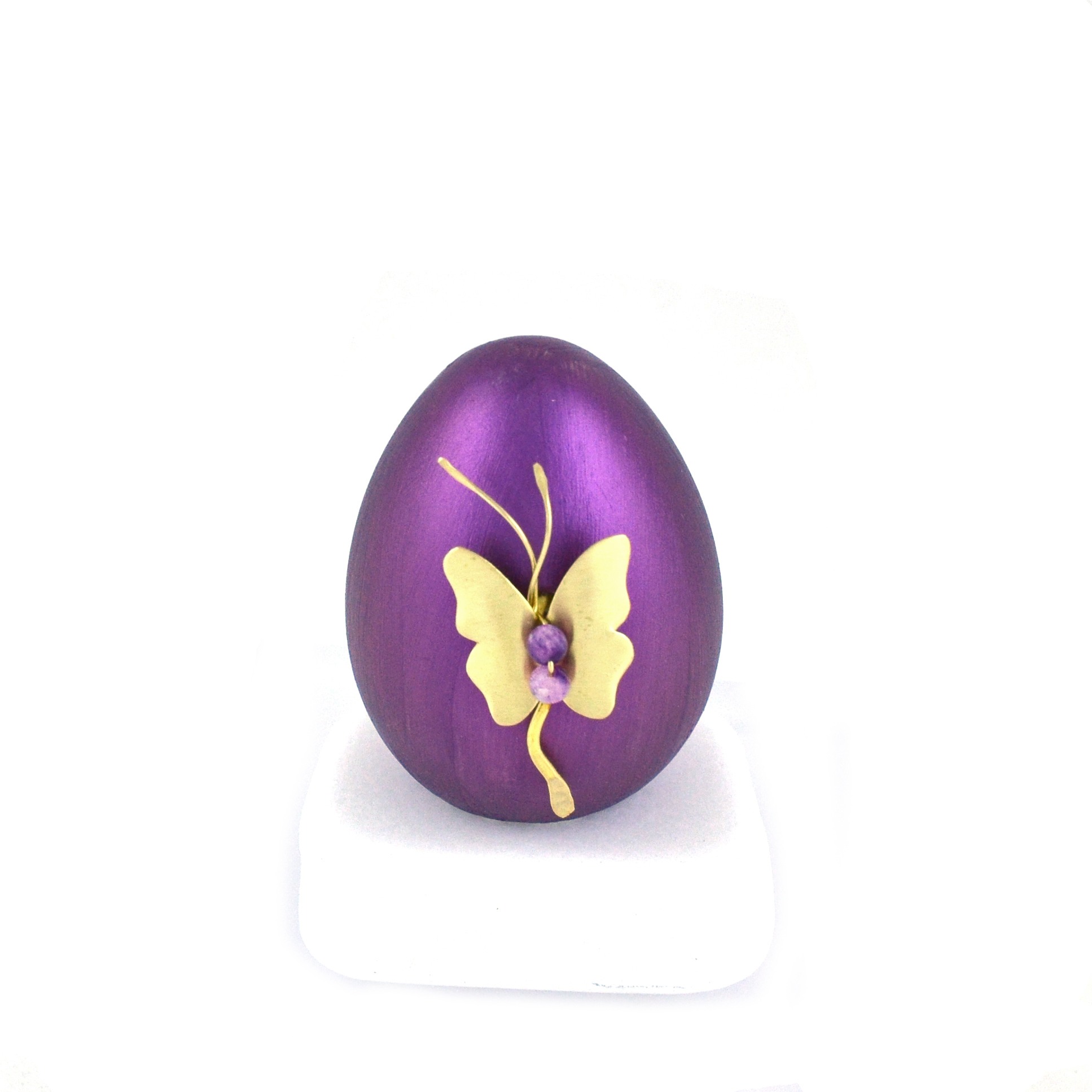 Διακοσμητικό πάνω σε μαρμάρινη βάση με μικρού μεγέθους αυγό και μεταλλικό στοιχείο.