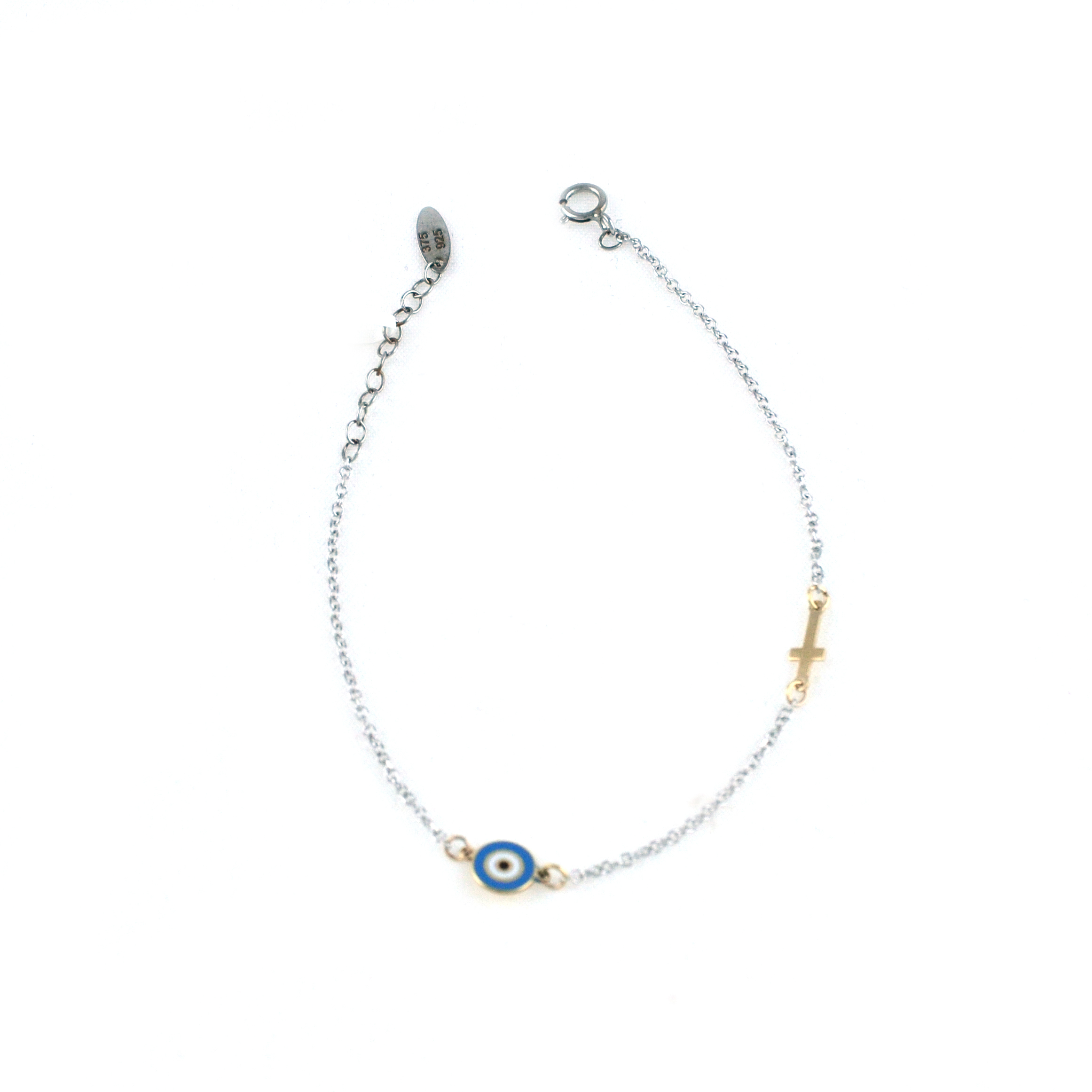 Βραχιόλι χρυσό 09 καρατίων με λεπτή αλυσίδα και ασημένια αλυσίδα από μοτίφ μάτι και σταυρό.