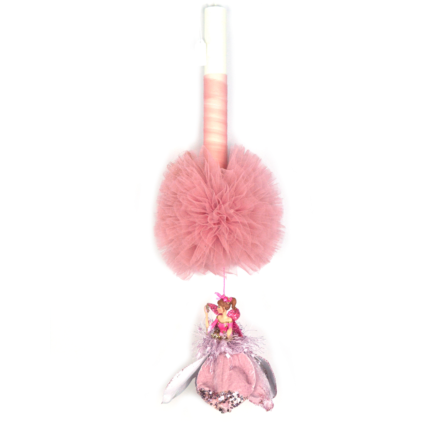 Λαμπάδα χειροποίητη με πούλιες, κοεδέλες και νεράιδα κρεμασμένη με φόρεμα από λουλούδι.