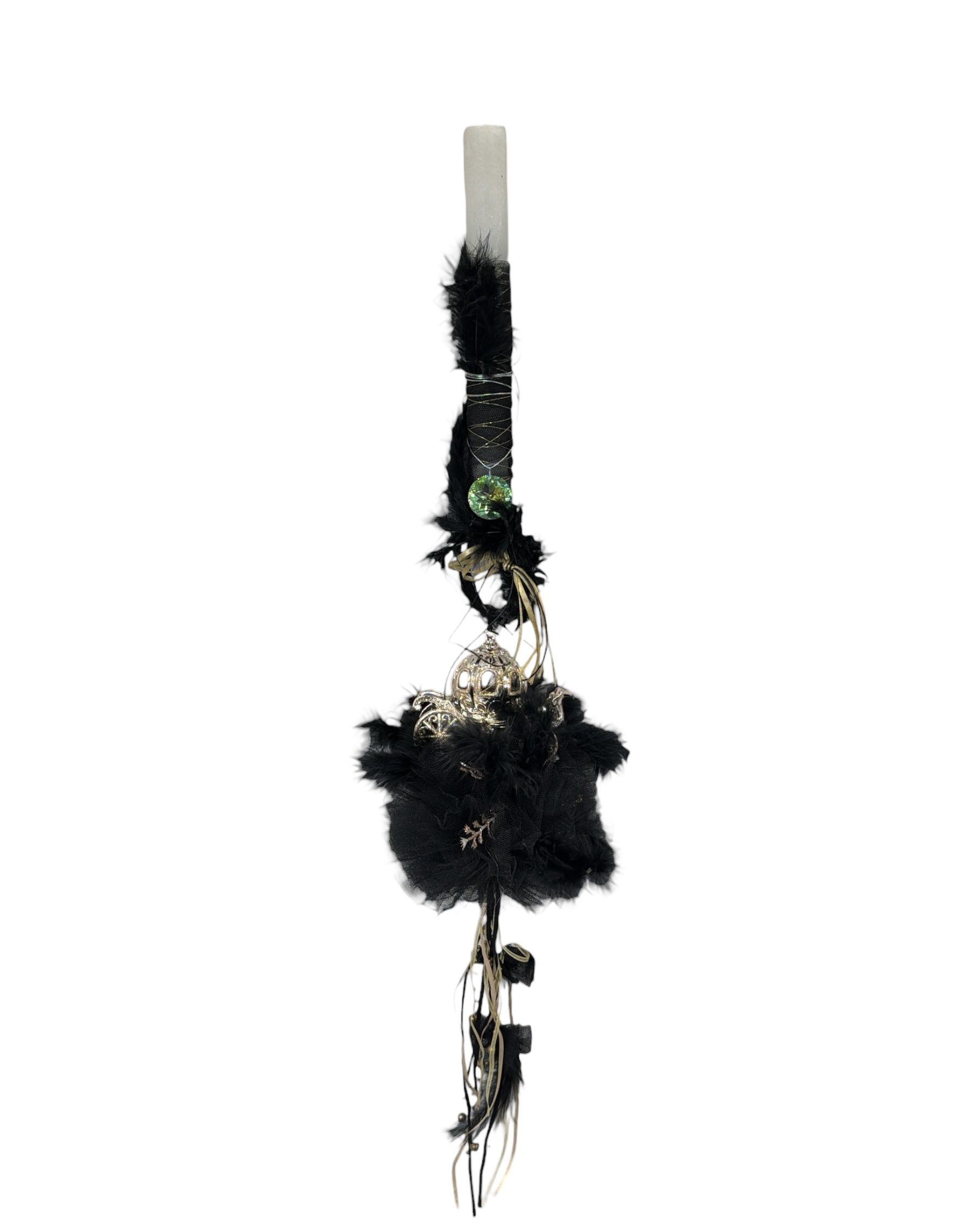 Λαμπάδα χειροποίητη με πούλιες, κοεδέλες και άμαξα κρεμασμένη πάνω σε πούπουλα. συνδυάζεται με κολιέ από στρογγυλό κρύσταλλο και κορδόνι.
