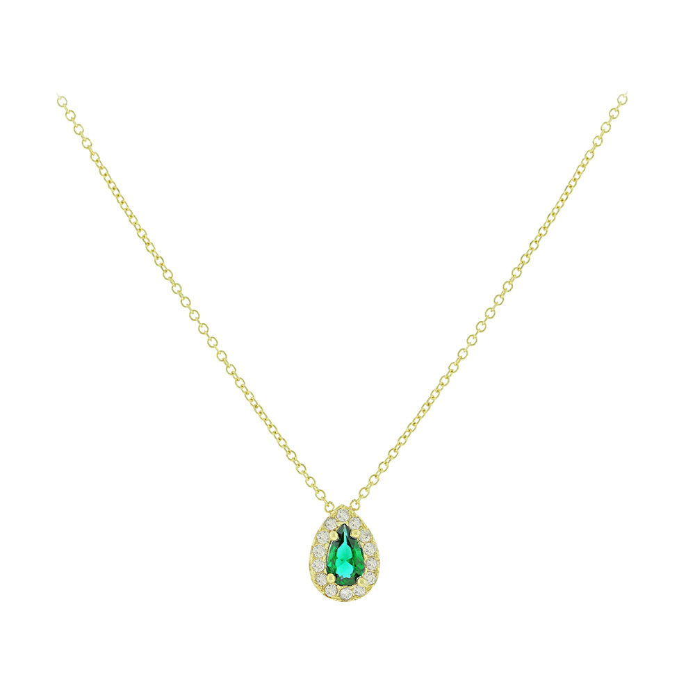 Κολιέ χρυσό 09 καρατίων.Ροζέτα με κεντρικό σμαραγδί ζιργκόν σε σχήμα δάκρυ και περιμετρικές ζιργκόν πέτρες καρφωμένες.