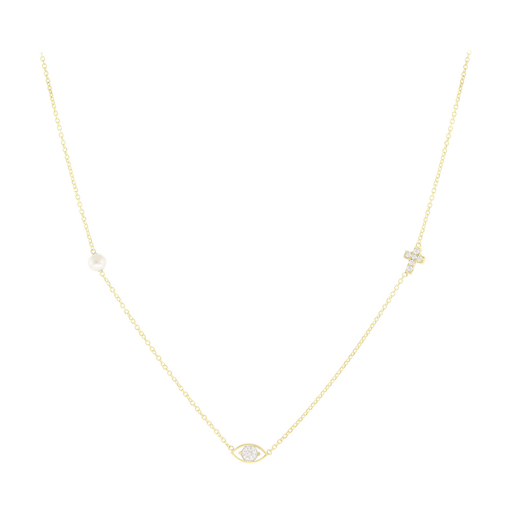 Κολιέ 09 καρατίων σε χρυσό χρώμα με ζιργκόν πέτρες στα περιμετρικά μοτίφ και μαργαριτάρι.