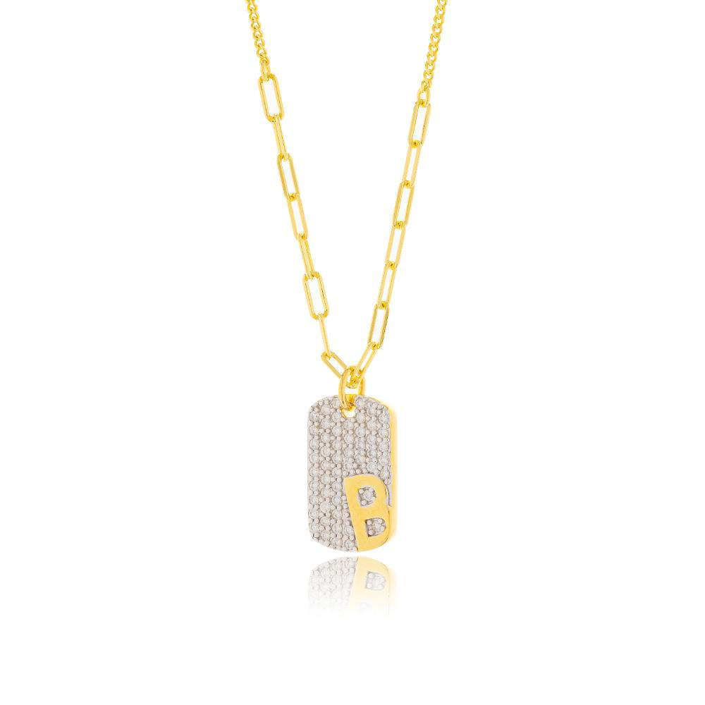 Κολιέ ασημένιο επιχρυσωμένο με ζιργκόν καρφωμένες πέτρες και μονόγραμμα.