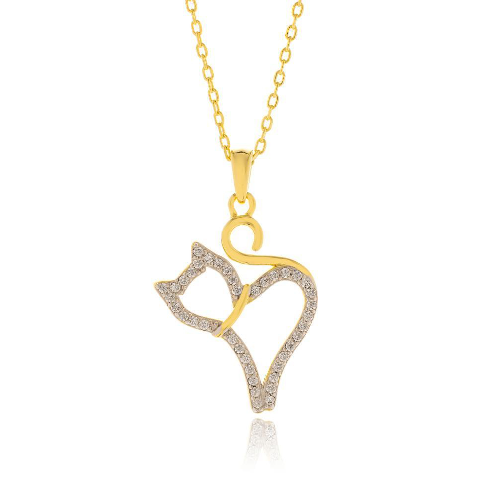 Κολιέ ασημένιο επιχρυσωμένο με ζιργκόν πέτρες καρφωμένες σε σχέδιο γάτας.