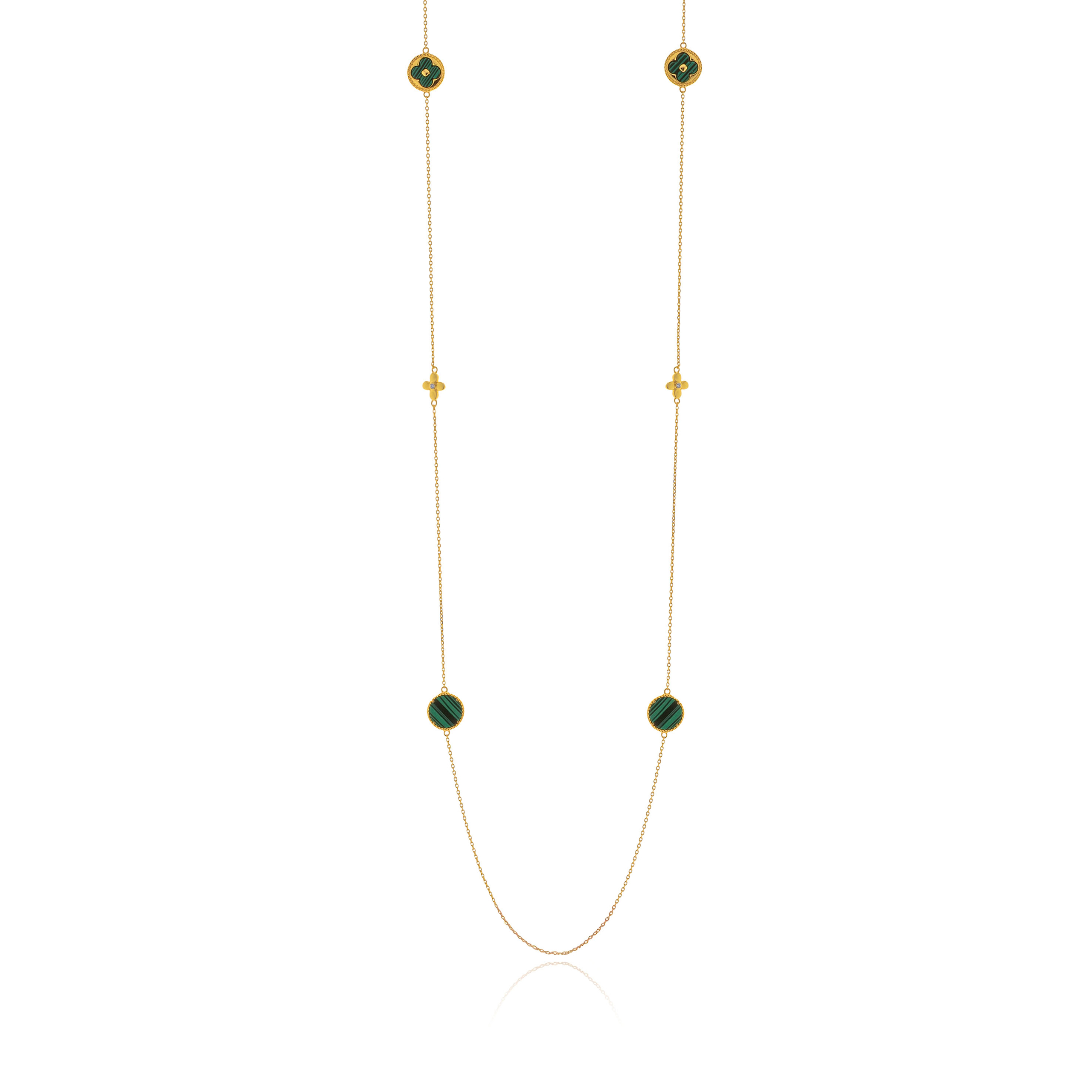 Κολιέ μακρύ, ασημένιο επιχρυσωμένο με μαλαχίτη πέτρες κατά μήκος.