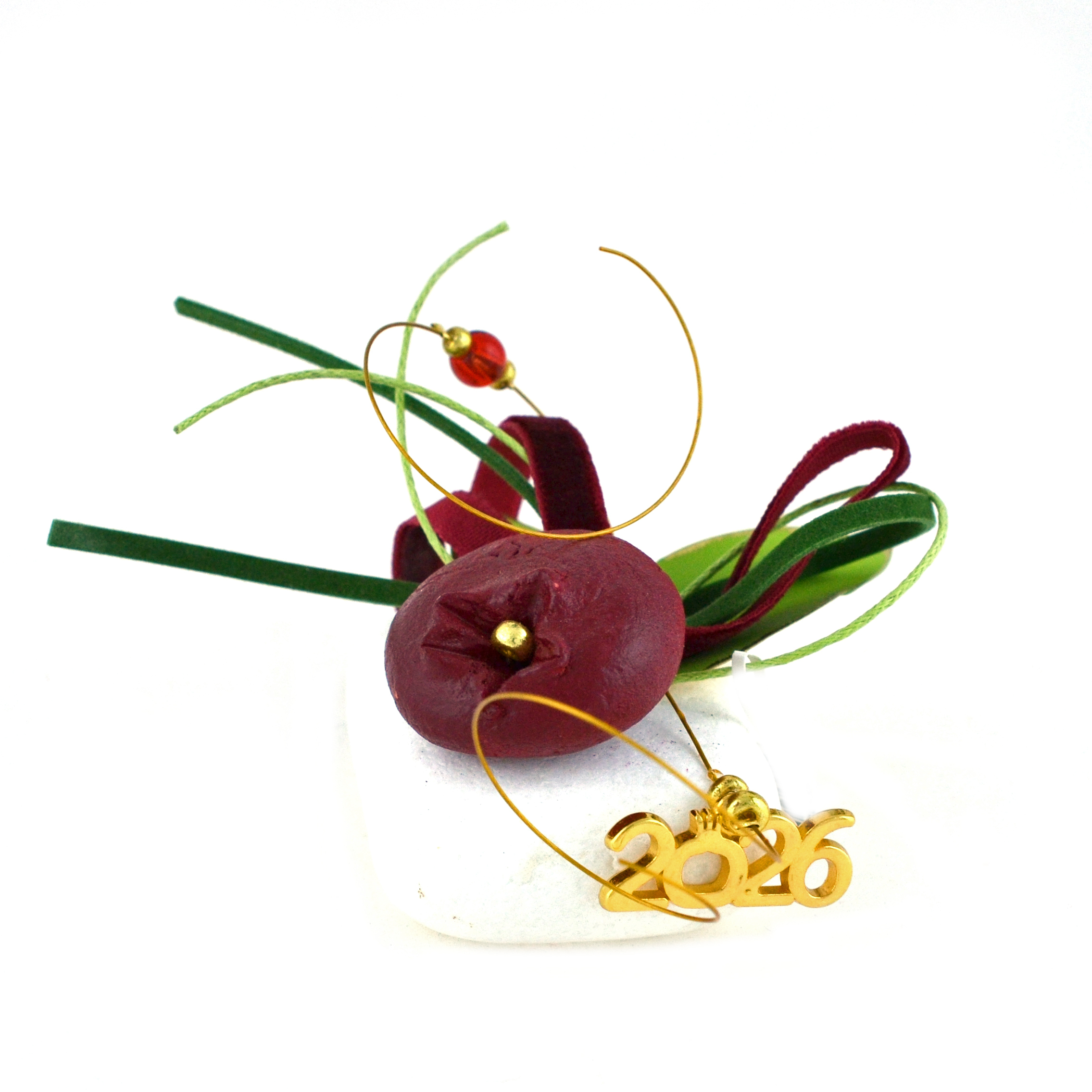 Διακοσμητικό χειροποίητο πάνω σε μαρμάρινη βάση και ρόδι με κορδέλες.