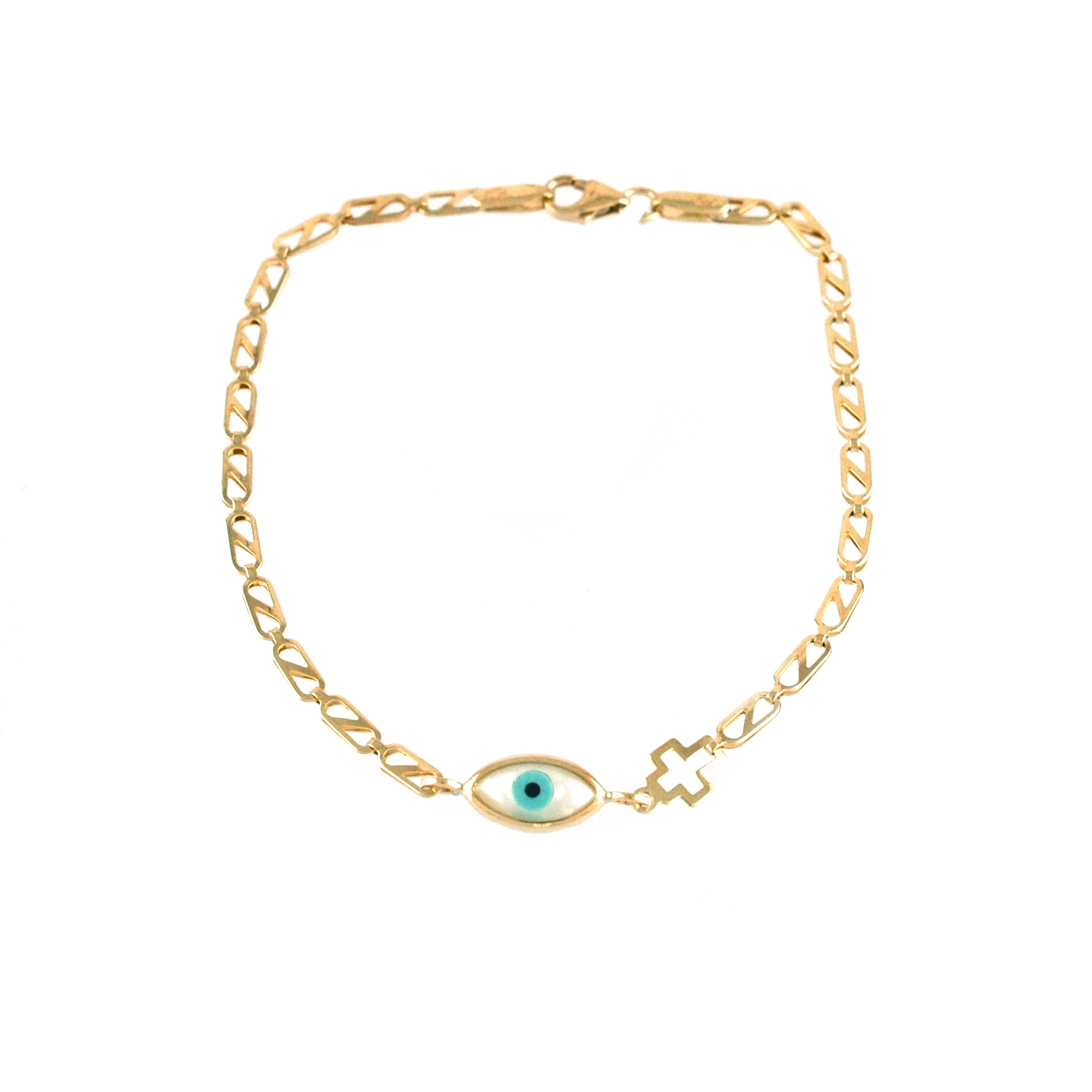 Βραχιόλι χρυσό 09 καρατίων με ανθεκτική αλυσίδα. Βραχιόλι με μάτι και σταυρό.