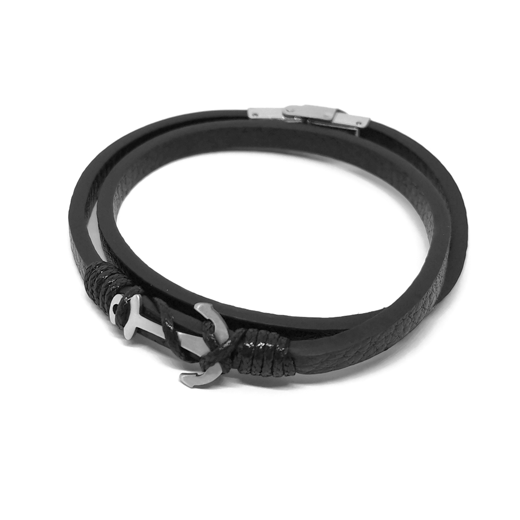 Βραχιόλι από ανοξείδωτο ατσάλι πάνω σε δερμάτινο λουρί μαύρου χρώματος .