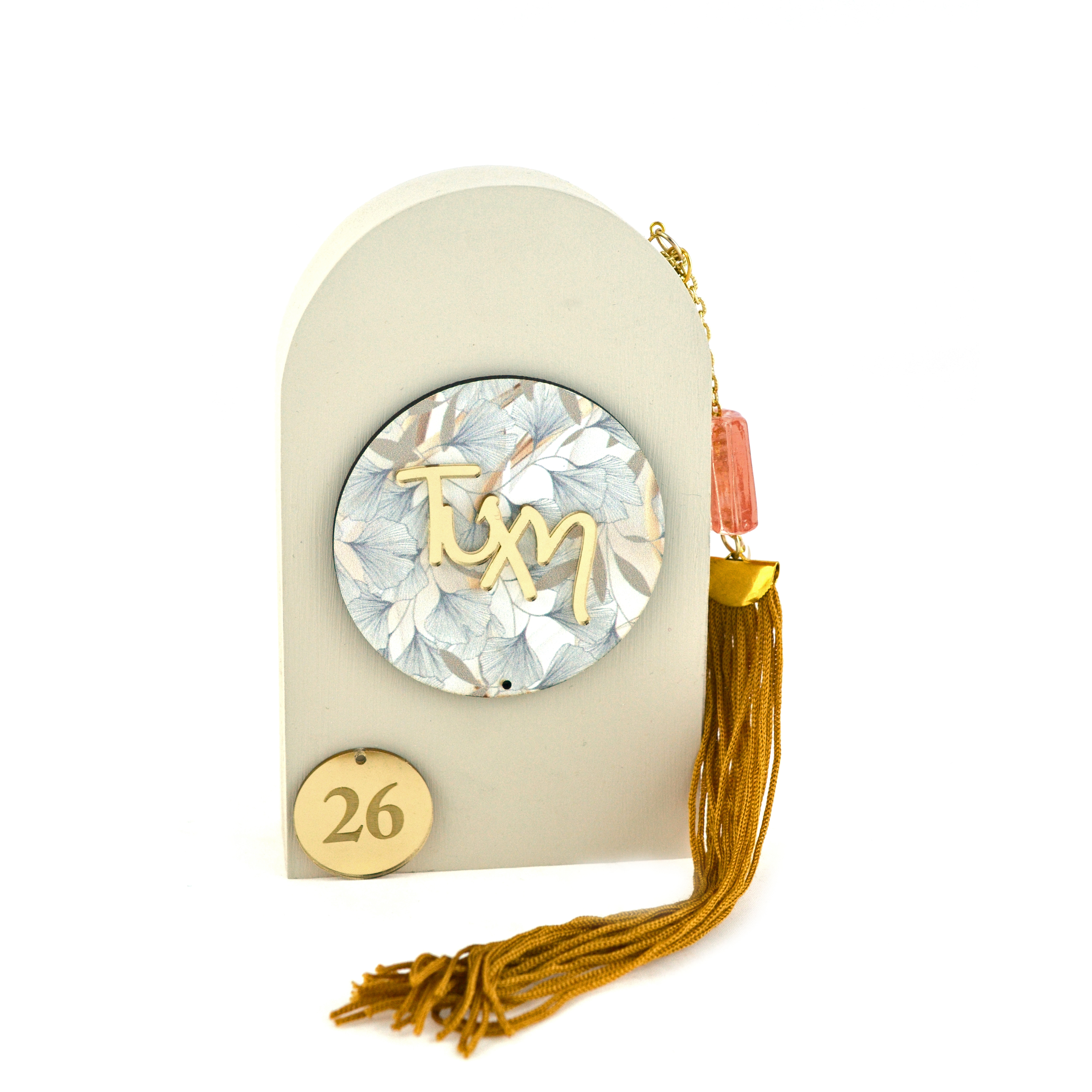 Διακοσμητικό χειροποίητο από ξύλινη βάση με ύφασμα και πλέξιγκλας.