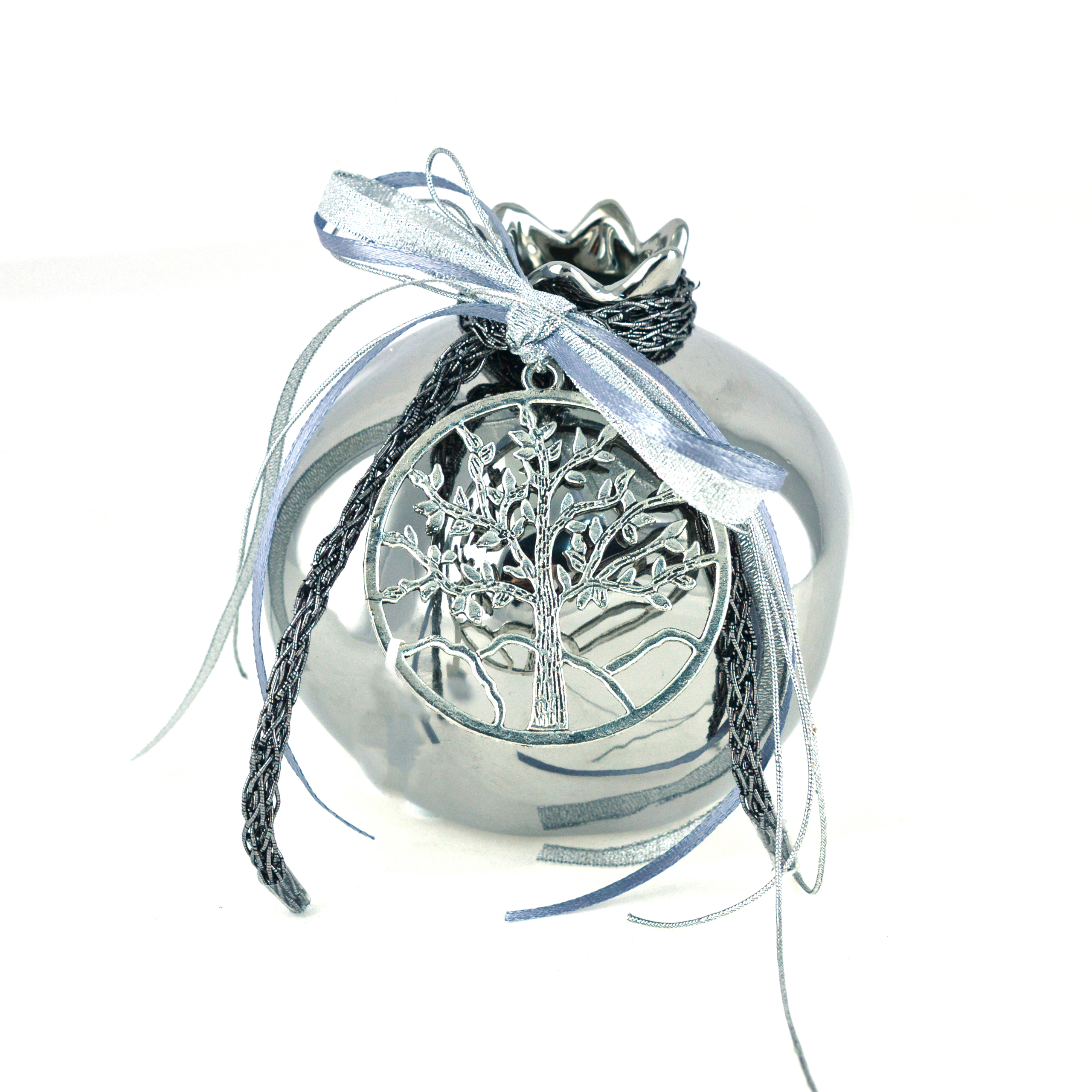 Χειροποίητο γούρι ρόδι μεσσαίου μεγέθους, κεραμικό σε άσπρο χρώμα στολισμένο με κόκκινα μικρότερα ρόδια.