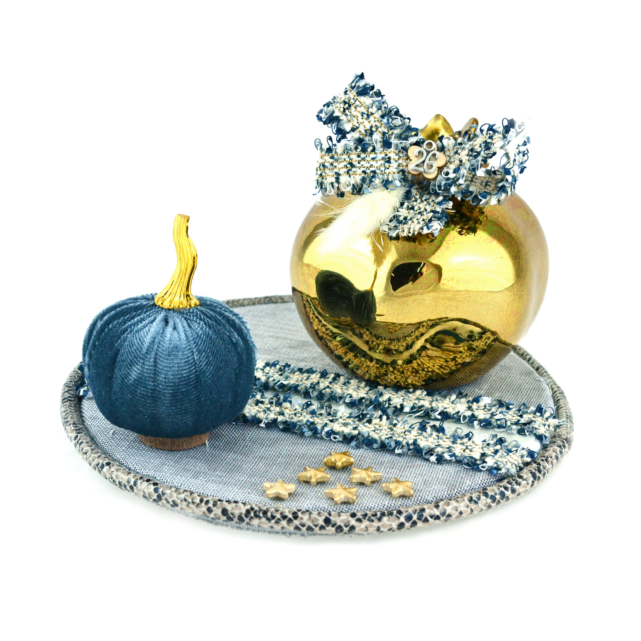 Χειροποίητο διακοσμητικό επιτραπέζιο με σύνθετα στοιχεία πάνω σε βάση ντυμένη με ύφασμα.