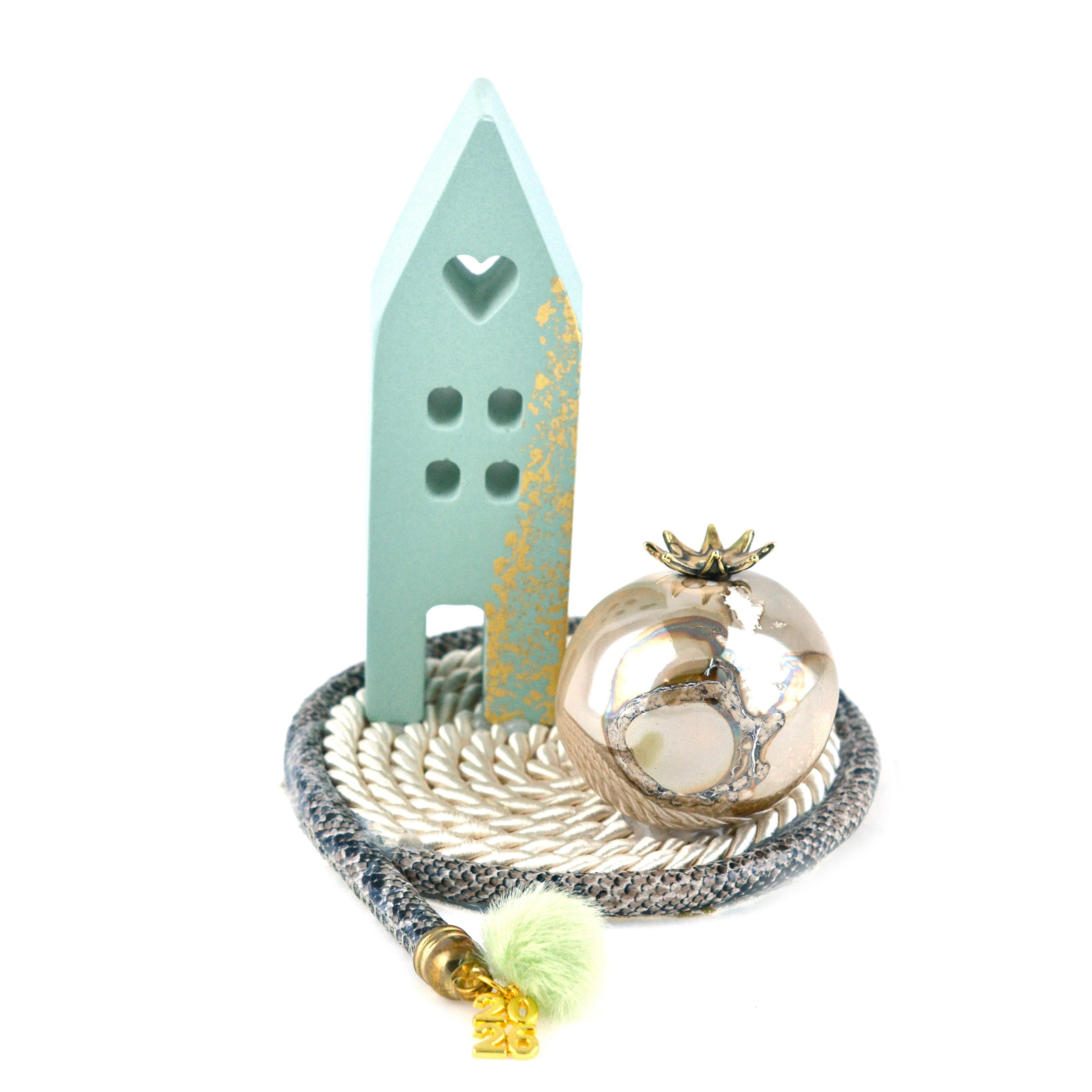 Χειροποίητο διακοσμητικό επιτραπέζιο με σύνθετα στοιχεία πάνω σε βάση από κορδόνι.