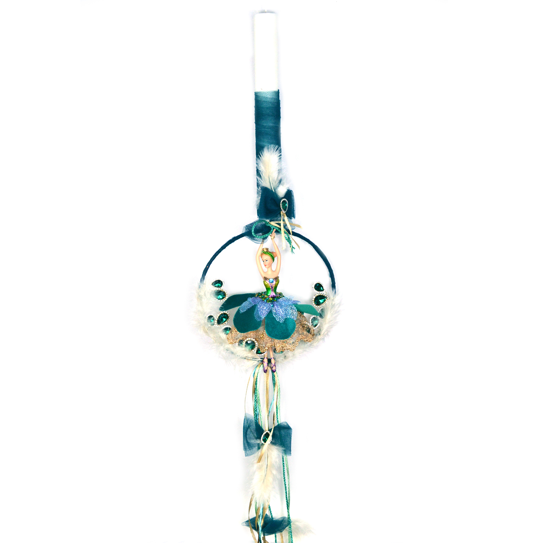 Λαμπάδα χειροποίητη με πούλιες, κοεδέλες και χορεύτρισ κρεμασμένη μέσα σε κύκλο.