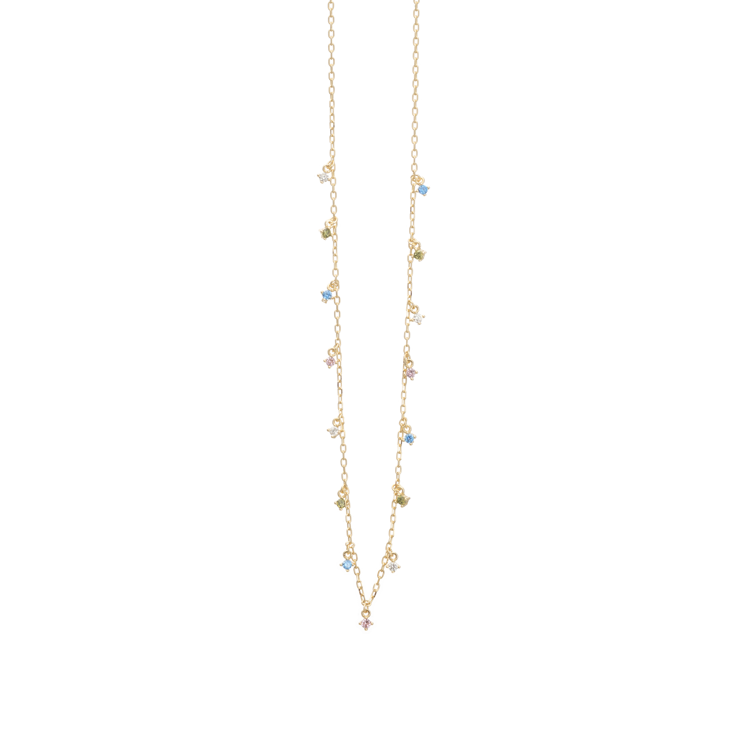 Κολιέ ασημένιο επιχρυσωμένο με ζιργκόν πέτρες πολύχρωμες κατά μήκος τησ αλυσίδας.