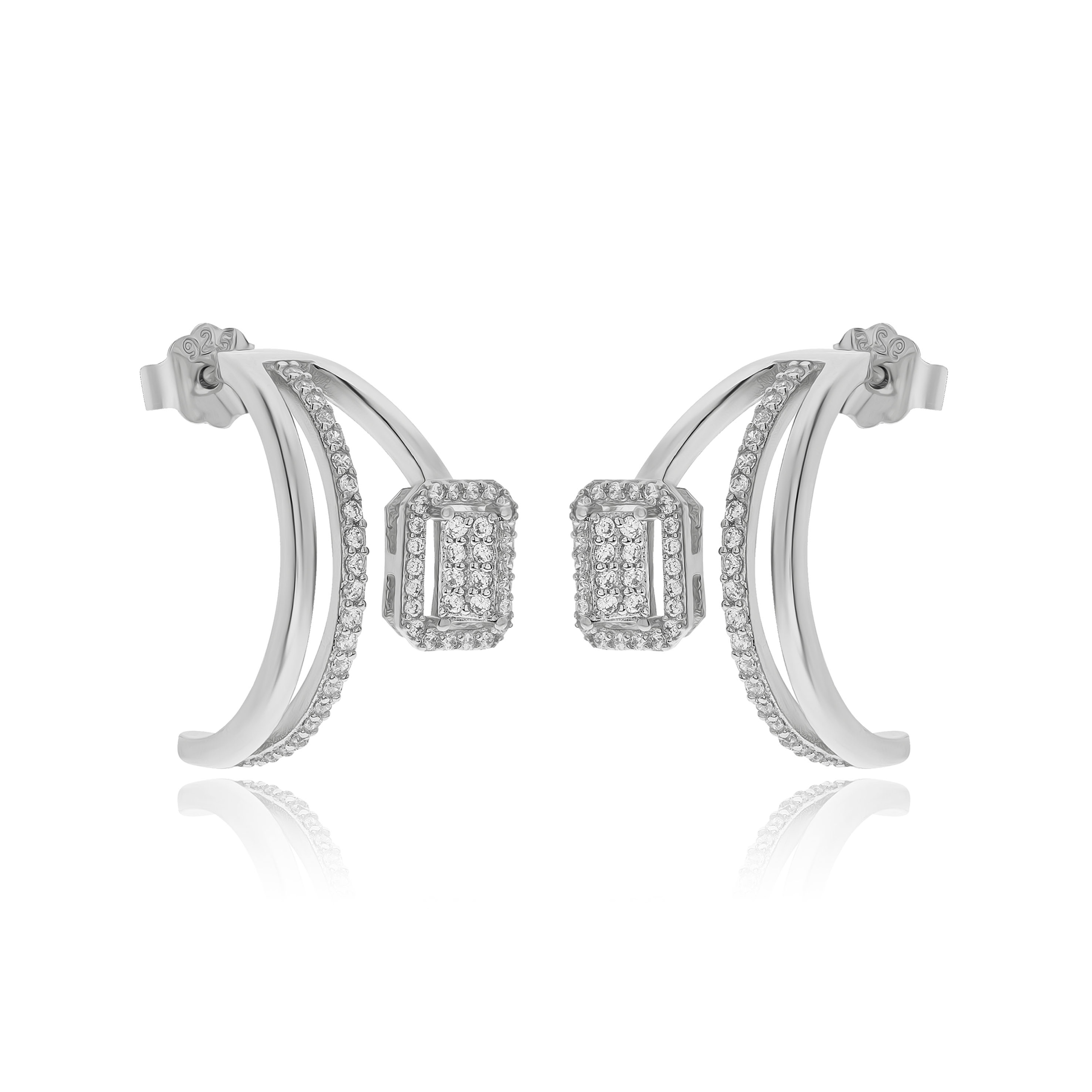 Σκουλαρίκια ασημένια σε σχέδιο κρίκου μεσσαίου μεγέθους με διακριτικές ζιργκόν πέτρες και σχέδιο ορθογώνιας ροζέτας .