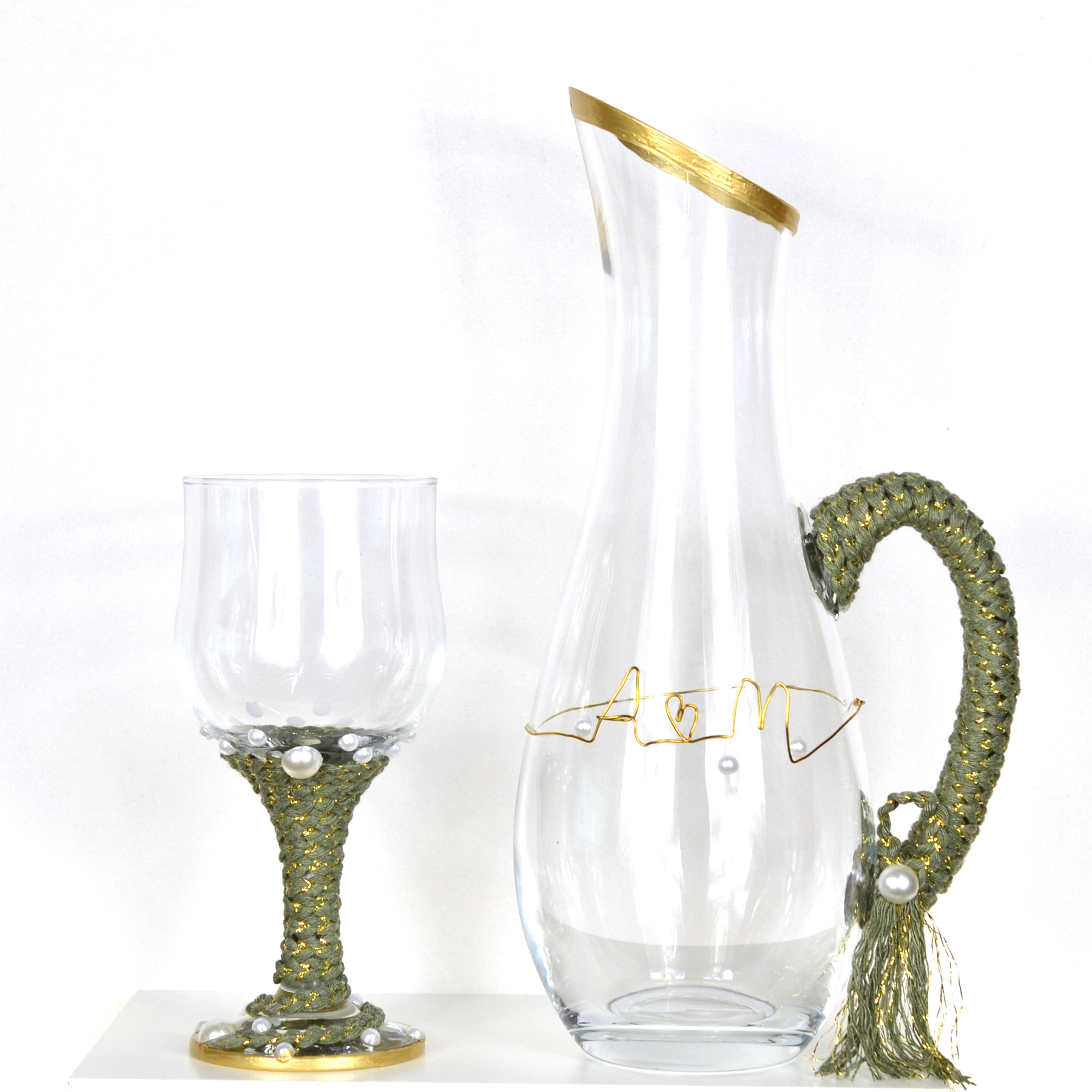 Καράφα και ποτήρι χειροποίητα με χρυσές λεπτομέριες, χακί χρωματισμοί, πέρλες και τα αρχικά του ζευγαριού από σύρμα.