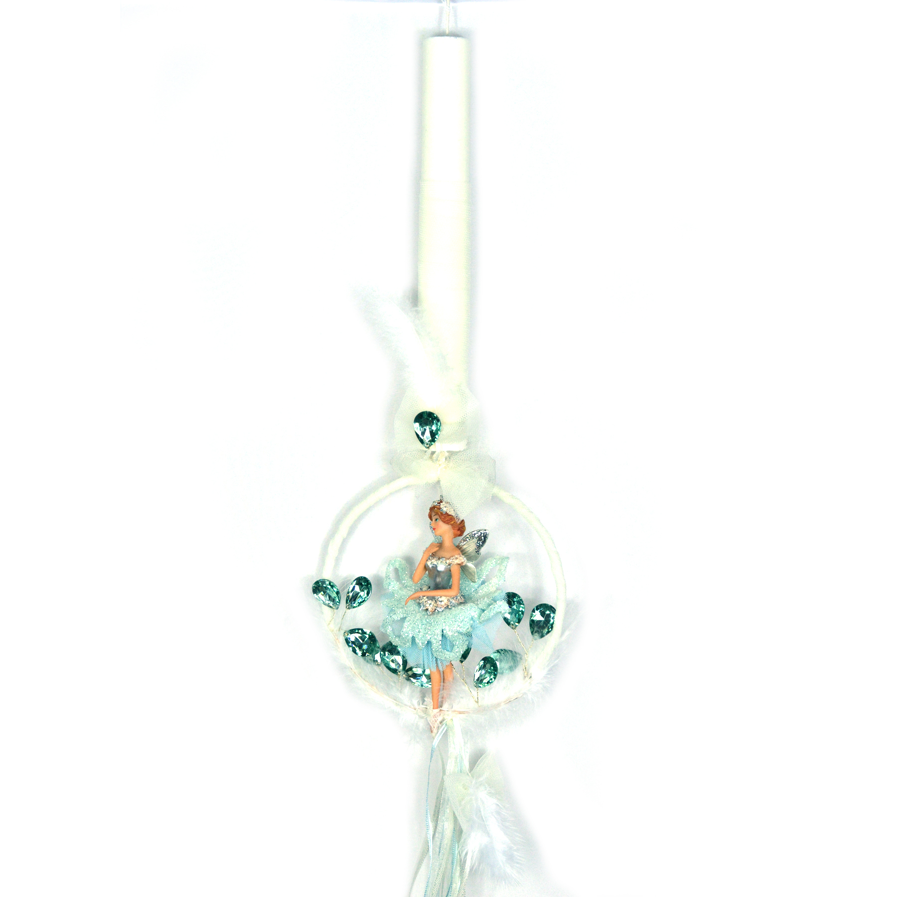 Λαμπάδα χειροποίητη με πούλιες, κοεδέλες και νεράιδα κρεμασμένη μέσα σε κύκλο.