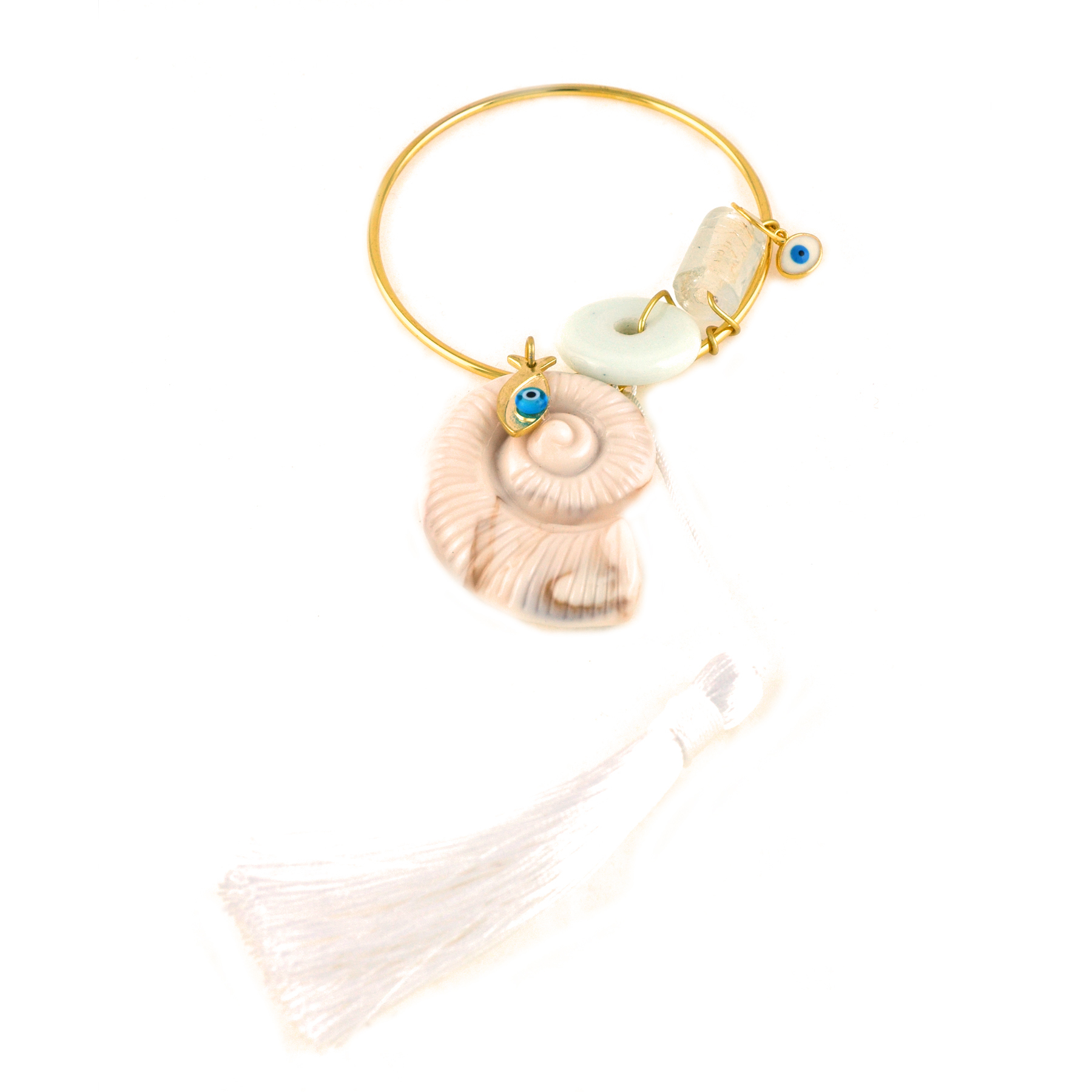 Χειροποίητο γούρι κρεμαστό με κοχύλι και μεταλλικά στοιχεία.