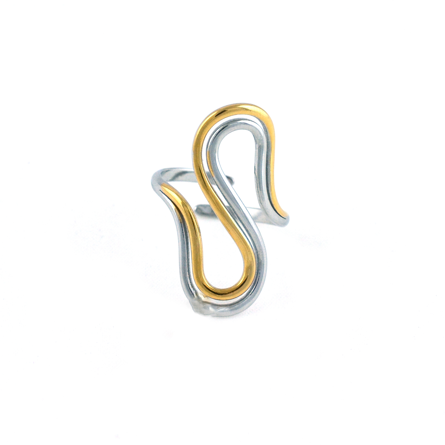 Δαχτυλίδι ατσάλινο σε ασημί και κίτρινο χρώμα σε μοντέρνο στυλ με σκέτη επιφάνεια και ανοιγόμενο.