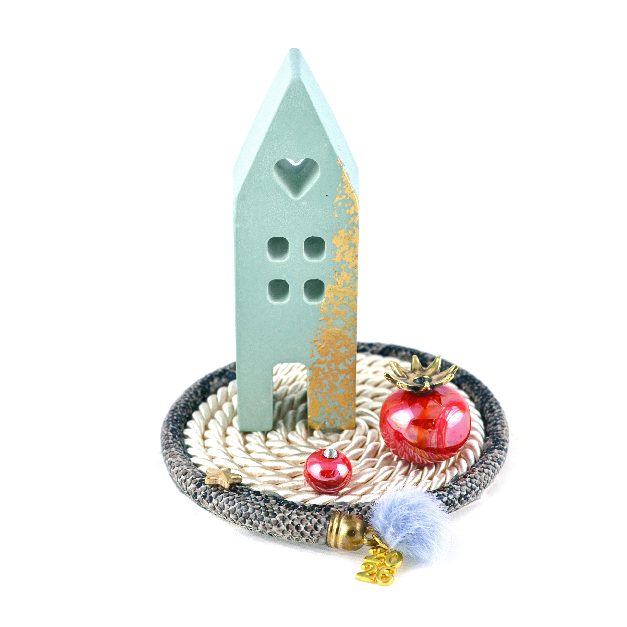 Χειροποίητο διακοσμητικό επιτραπέζιο με σύνθετα στοιχεία πάνω σε βάση από κορδόνι.