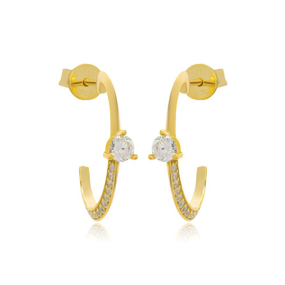 Σκουλαρίκια ασημένια επιχρυσωμένα σε σχέδιο κρίκων μεσσαίου μεγέθους με ζιργκόν πέτρες καρφωμένες.