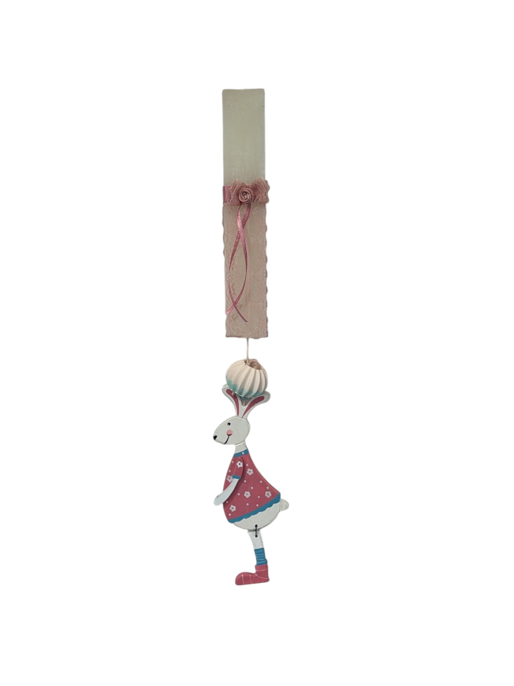 Λαμπάδα χειροποίητη λευκή τετραγωνισμένη με κορδέλες και λαγό ξύλινο κρεμασμένο στο κάτω μέρος.
