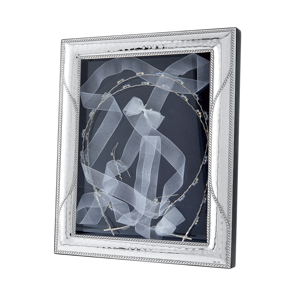 Στεφανοθήκη 28x33 cm  με αμετάβλητο κράμα ασημιού και ξύλο στο πίσω μέρος. Υπάρχει υποδοχή για στήριξη ή κρέμασμα σε τοίχο.