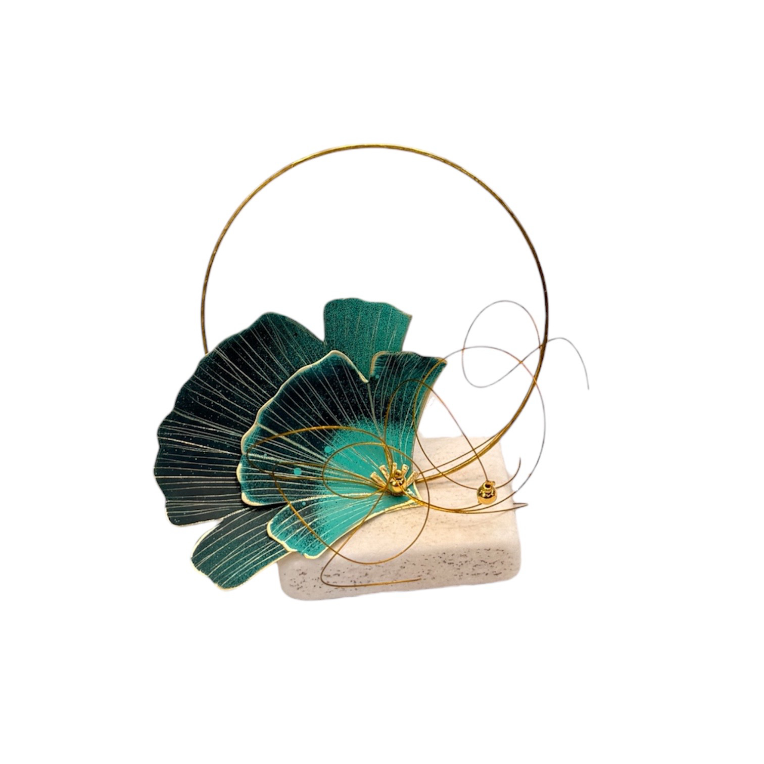 Διακοσμητικό πάνω σε μαρμάρινη βάση με μεταλλικό κλαδί λουλουδιού.