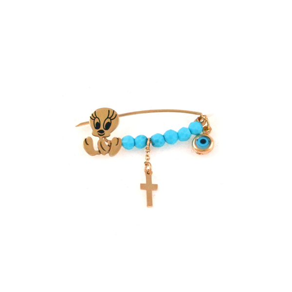 Παιδική παραμάνα σε 09 καράτια χρυσού με τυρκουάζ πέτρες και κρεμαστό σταυρό και μάτι.