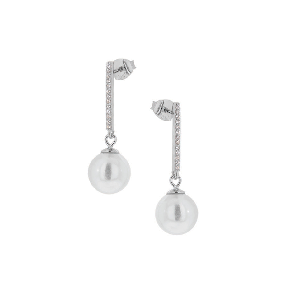 Ασημένια σκουλαρίκια καρφωτά, κρεμαστά με ζιργκόν καρφωμένες πέτρες στην επιφάνεια και κρεμαστή πέρλα.
