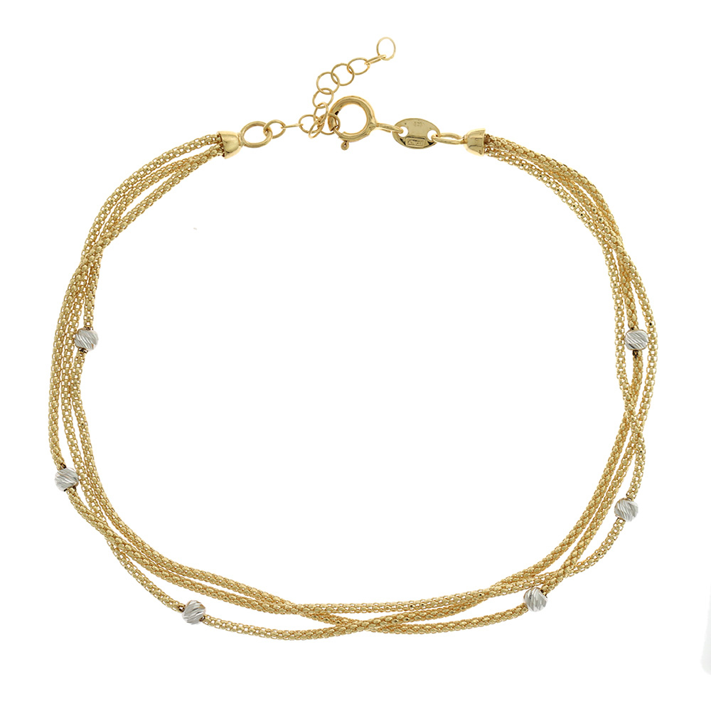 Βραχιόλι με πολλαπλές αλυσίδες σε χρυσό 14 καρατίων με σφυρήλατες μίλιες σε λευκό χρώμα.