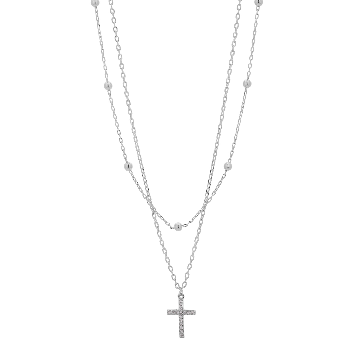 Κολιέ ασημένιο με διπλή αλυσίδα και ζιργκόν πέτρες καρφωμένες πάνω στον σταυρό.