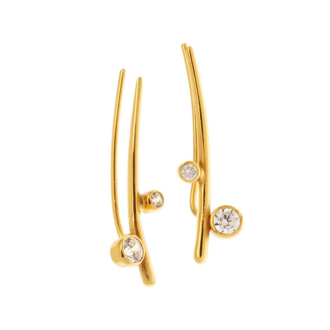 Σκουλαρίκια κρεμαστά ασημένια σε κίτρινο χρυσό χρώμα με μοντέρνο σχέδιο και ζιργκόν πετρες. Κούμπωμα γάτζος που στέκεται στον λοβό.