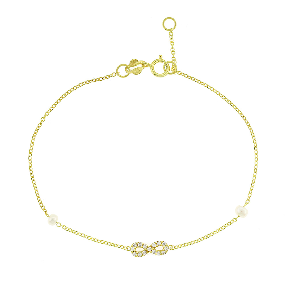 Βραχιόλι χρυσό 09 καρατίων με λεπτή αλυσίδα και ζιργκόν πέτρες στο άπειρο και μαργαριτάρια.