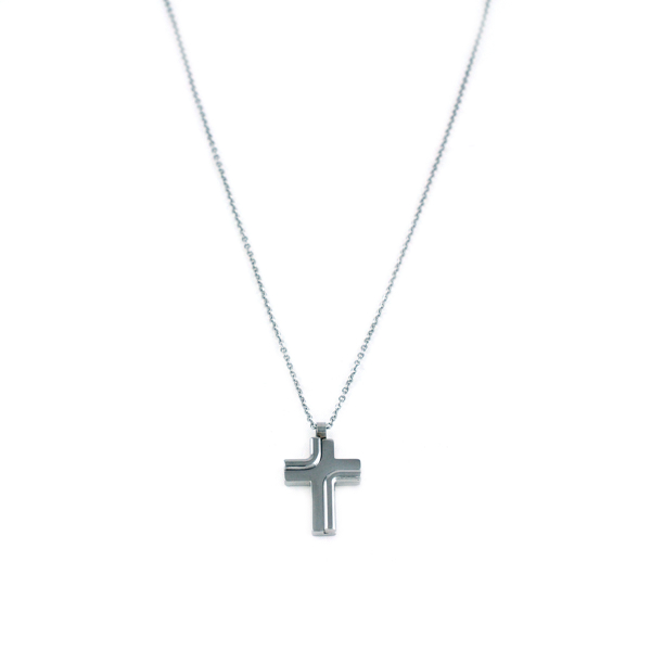 Ατσάλινο μενταγιόν από ανοξείδωτο ατσάλι σε ασημί χρώμα και σχήμα σταυρού.