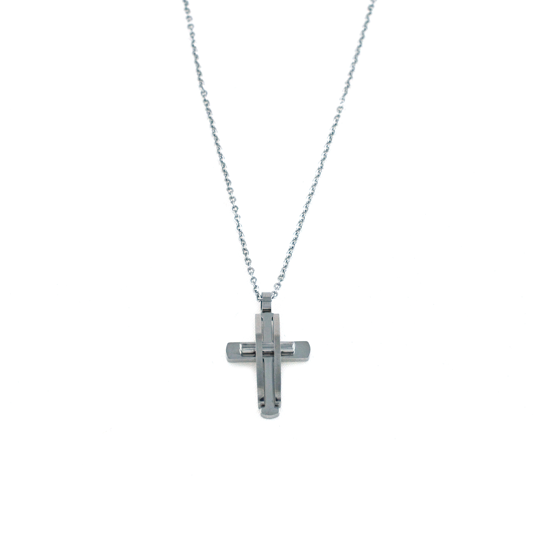 Ατσάλινο μενταγιόν από ανοξείδωτο ατσάλι σε ασημί χρώμα και σχήμα σταυρού.