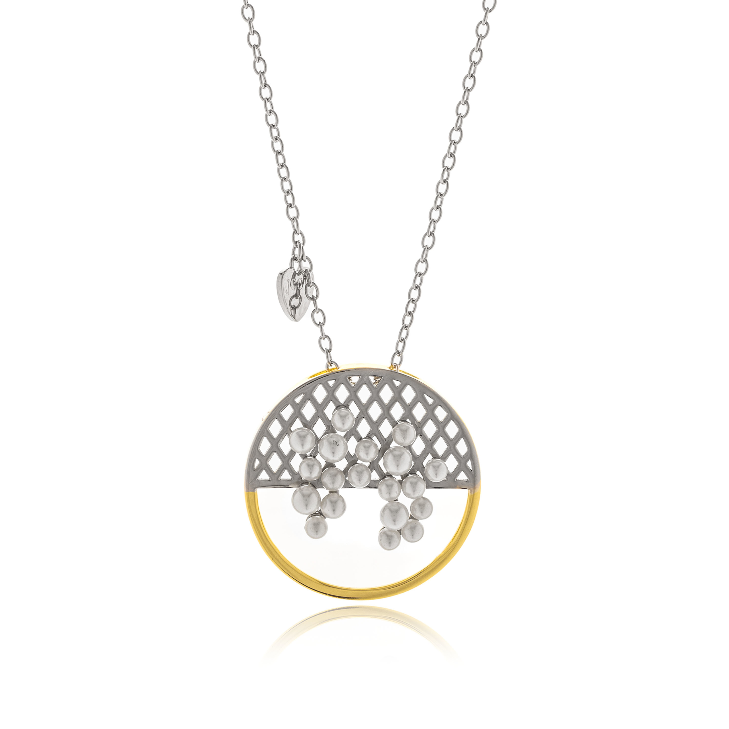 Κολιέ ασημένιο με διχρωμία μετάλλων , πέτρες μαργαριτάρια και εντυπωσιακό μενταγιόν.