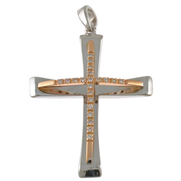 Σταυρός χρυσός 18 καρατίων σε μεγάλο μέγεθος με απλό, λεπτό σχέδιο απο ροζ και λευκό χρυσό. Πέτρες διαμάντια σε κοπή brilliants 0.08ct . Σταυρός στα 3,30 γρ.
